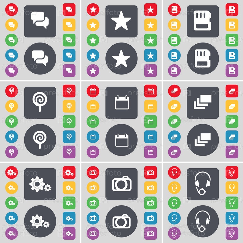 Чат, звезда, SIM-карты, календарь, галерея, Гир, конфета, камера, символ значка наушников. Большой набор плоских цветных кнопок для вашего дизайна. вектор