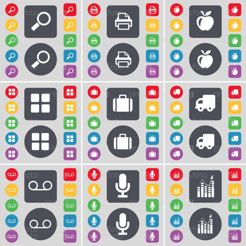 Зеркало увеличения, принтер, Приложения, приложения, чемодан, грузовик, кассеты, микрофон, граф значок символа. Большой набор плоских цветных кнопок для вашего дизайна. Вектор