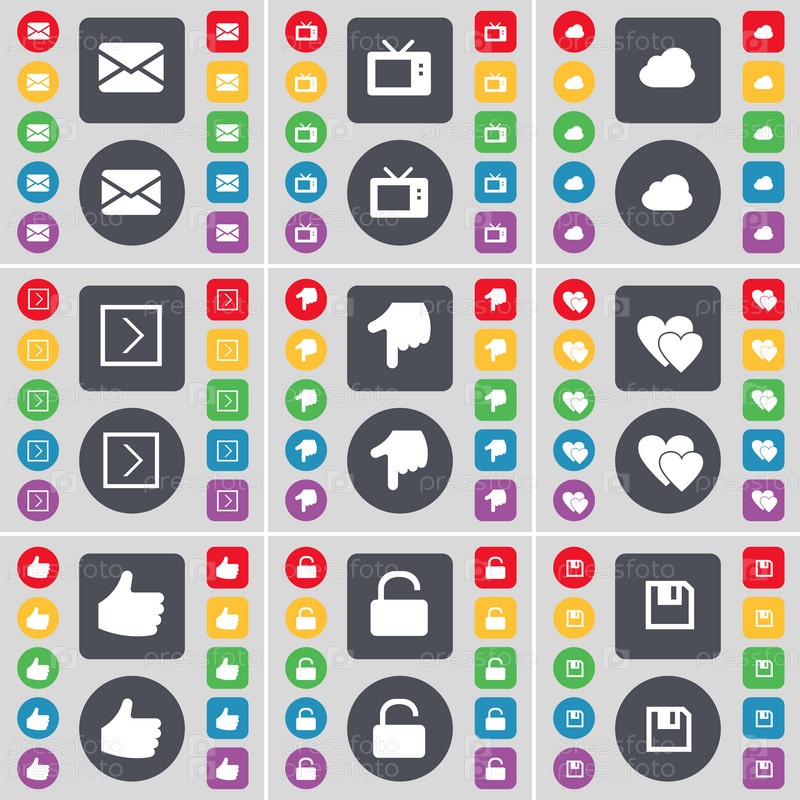 Сообщение, Ретро ТВ, облако, стрелку справа, руки, сердце, как, замок, гибких значок символа. Большой набор плоских, цветные кнопки для вашего дизайна. Вектор