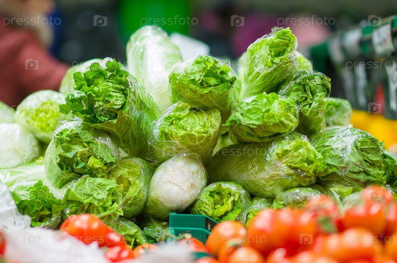 Разнообразие китайской капусты и помидоров в коробках в супермаркете