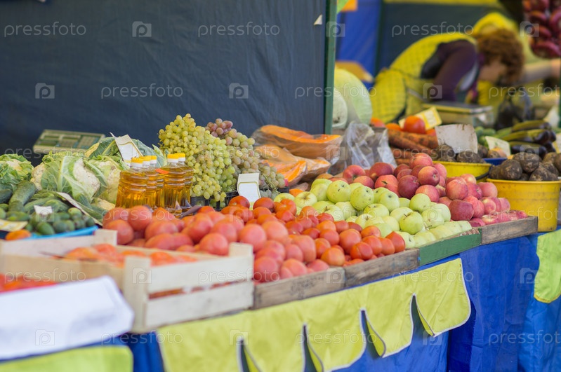 Помидоры, яблоки, капуста брокколи и подсолнечного масла на рынок города