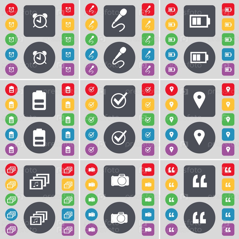 Будильник, микрофон, батарея, тик, контрольно-пропускной пункт, галерея, камеры, цитата Марк значок символа. Большой набор плоских, цветные кнопки для вашего дизайна. Вектор