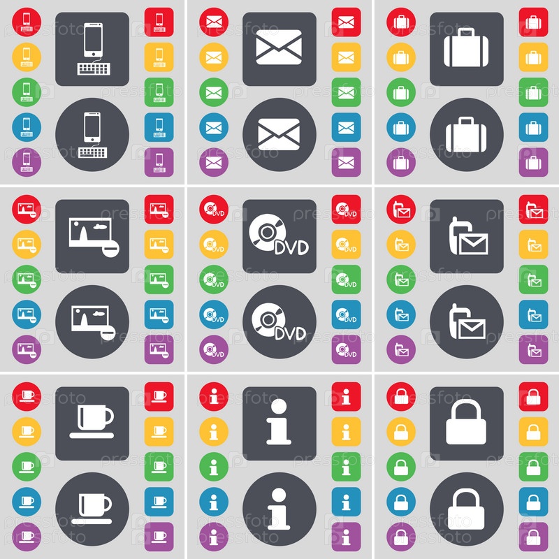 Смартфон, сообщение, чемодан, фотография, DVD, SMS, чаша, информация, символ иконки замка. большой набор плоских цветных кнопок для вашего дизайна. вектор