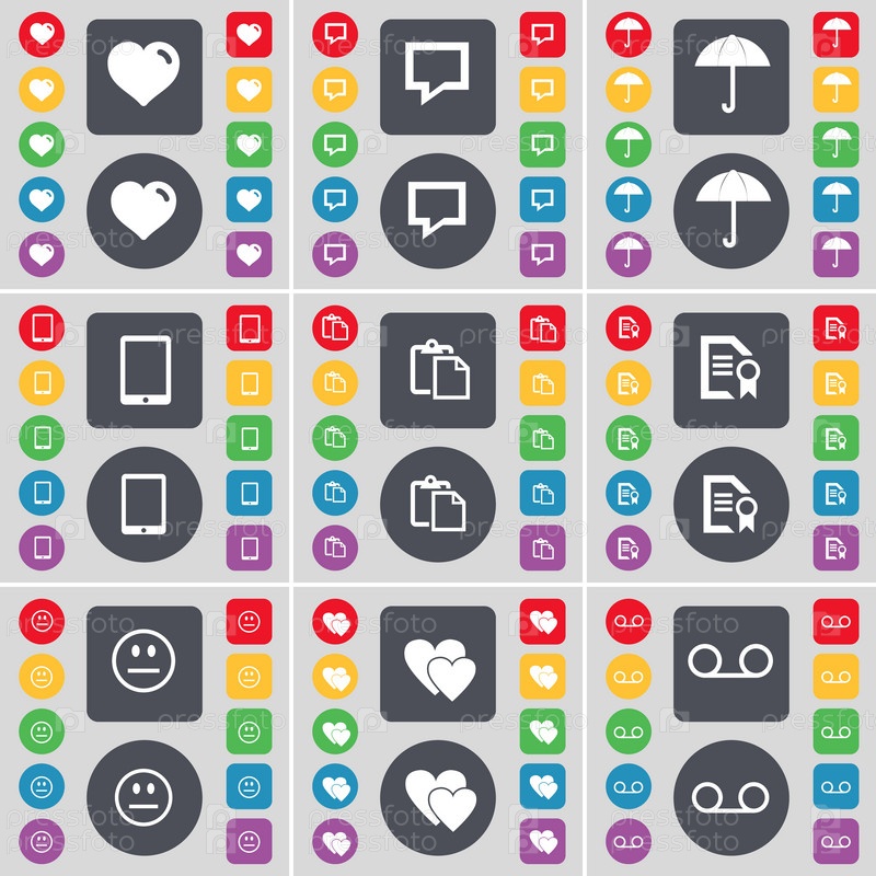 Сердце, пузырь чата, зонтик, планшетный ПК, опросы, текстовый файл, улыбка, сердце, иконка символа кассеты. Большой набор плоских цветных кнопок для вашего дизайна. вектор