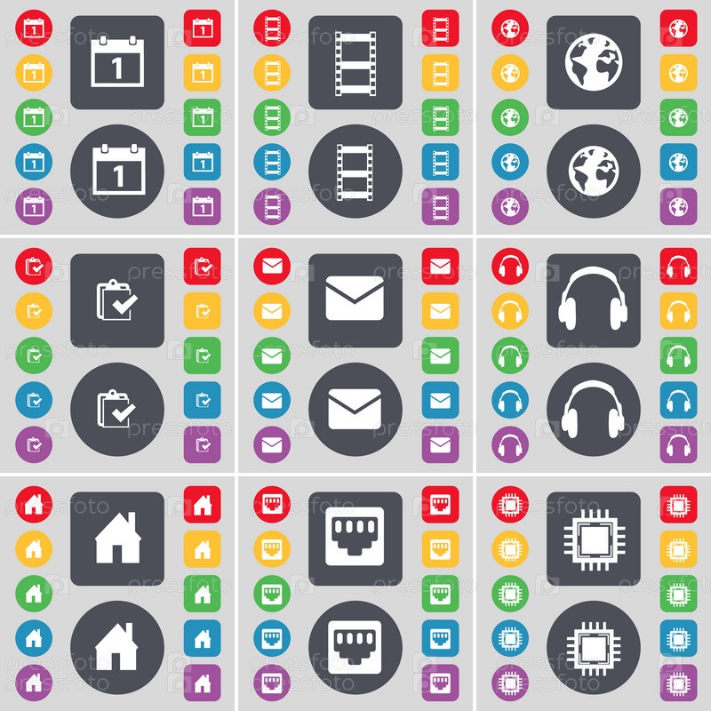 Календарь, негативных пленок, земля, обследования, сообщение, наушники, дом, гнездо локальной сети, процессора значок символа. Большой набор плоских, цветные кнопки для вашего дизайна. Вектор