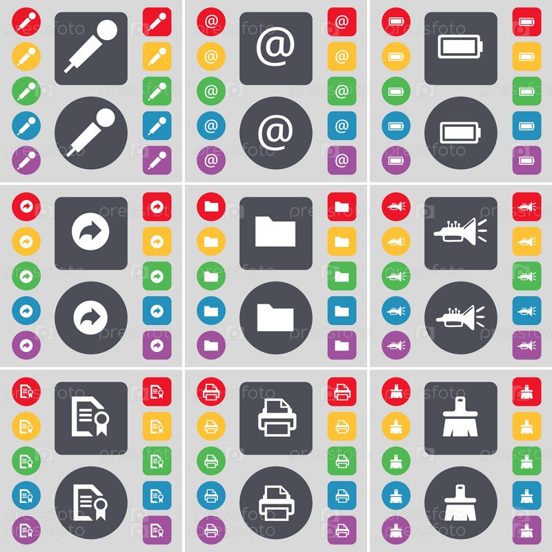 Микрофон, почта, батарея, спинка, папка, Trumped, текстовый файл, принтер, кисть значок символа. Большой набор плоских цветных кнопок для вашего дизайна. вектор