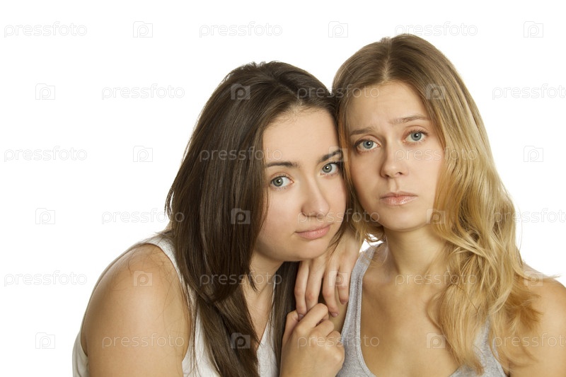 Портрет двух девушек: блондинки и брюнетки. Изолированы на белом фоне