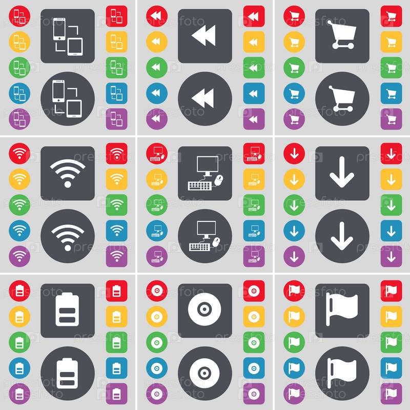 Подключение, Rewind, корзина, Wi-Fi, ПК, стрелка вниз, батарея, диск, символ значка флага. большой набор плоских цветных кнопок для вашего дизайна. вектор