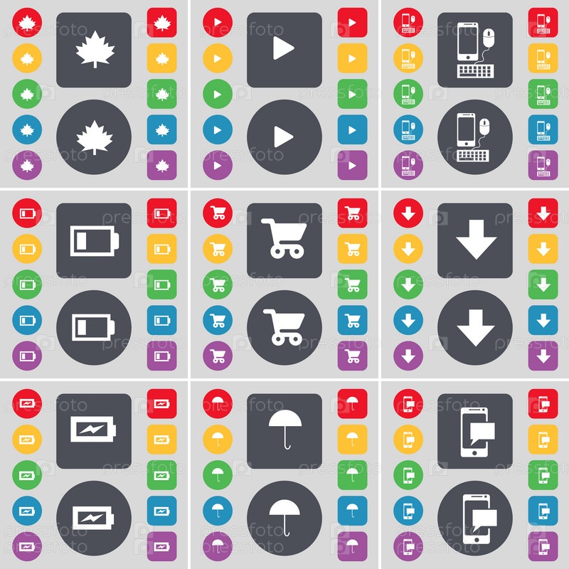 Кленовый лист, медиаплейер, смартфон, батарея, корзина покупок, стрелка вниз, зарядка, зонтик, символ значка SMS. Большой набор плоских цветных кнопок для вашего дизайна. вектор