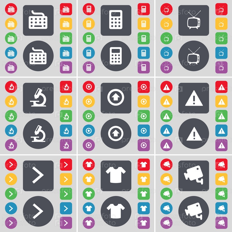 Клавиатура, мобильный телефон, ретро-телефон, микроскоп, стрелка вверх, предупреждение, стрелка направо, футболка, значок символа CCTV. Большой набор плоских цветных кнопок для вашего дизайна. вектор