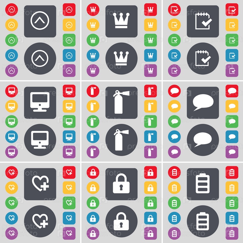 Стрелка вверх, Корона, обследования, монитор, Огнетушитель, чат пузыря, сердца, замок, значок символ батареи. Большой набор плоских, цветные кнопки для вашего дизайна. Вектор
