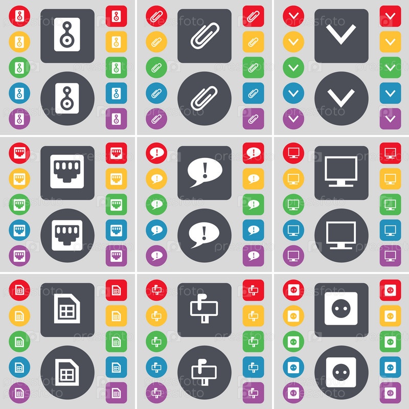 Спикер, клип, стрелка вниз, разъем LAN, пузырь чата, монитор, файлы, почтовый ящик, значок символа Socket. Большой набор плоских цветных кнопок для вашего дизайна. вектор