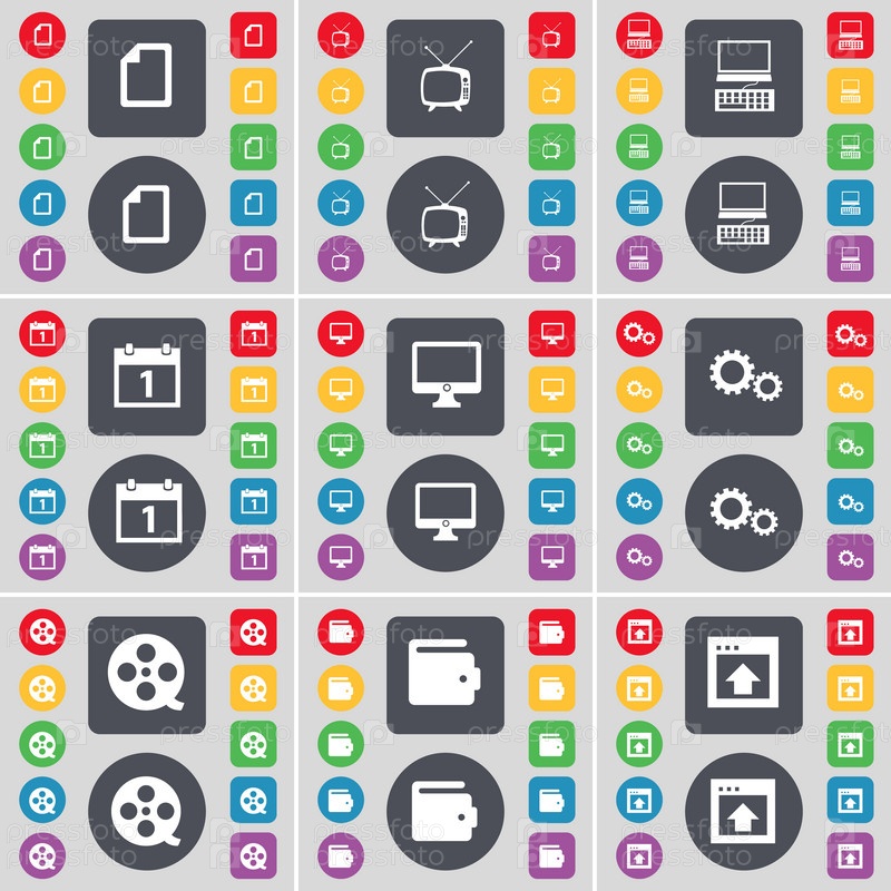 Огонь, Ретро ТВ, ноутбук, календарь, монитор, снаряжение, видеозапись, бумажник, окна значок символа. Большой набор плоских, цветные кнопки для вашего дизайна. Вектор