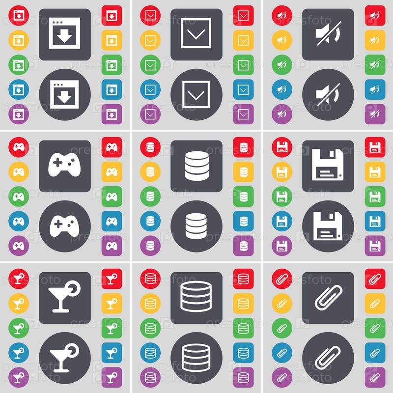 Окна, стрелка вниз, Mute, геймпад, базы данных, флоппи, коктейль, базы данных, значок символа фрагмента ролика. Большой набор плоских цветных кнопок для вашего дизайна. вектор