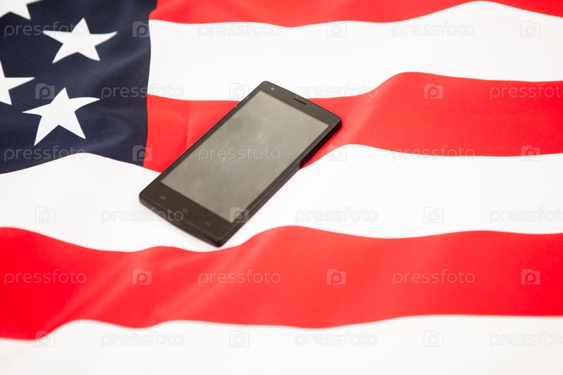 Черный смартфон на флаге Соединенных Штатов Америки