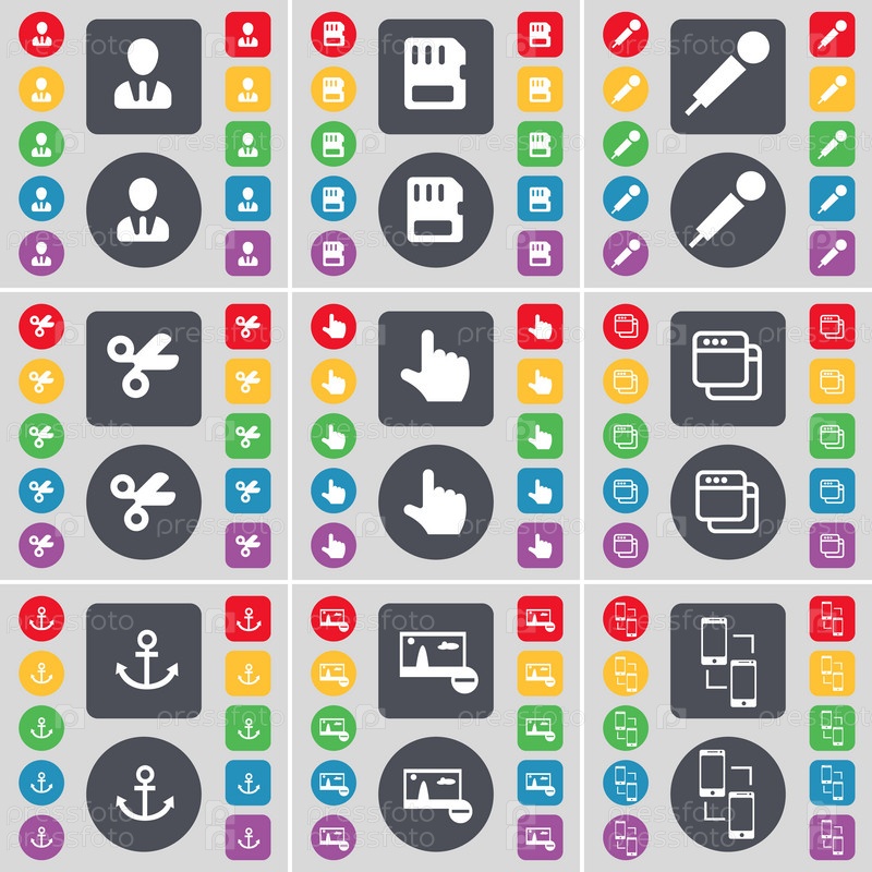 Аватар, SIM-карта, микрофон, ножницы, рука, окна, якорь, фотография, символ значка подключения. Большой набор плоских цветных кнопок для вашего дизайна. вектор