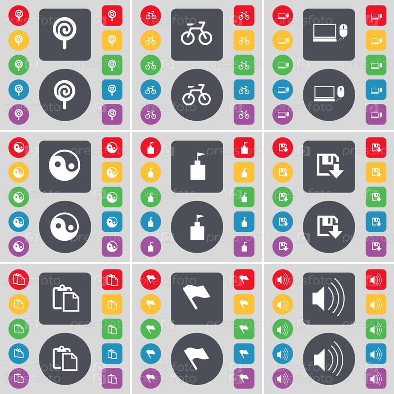 Леденец, велосипед, ноутбук, Инь-Ян, флаг башня, флоппи, обследования, флаг, символ значок звука. Большой набор плоских, цветные кнопки для вашего дизайна. Вектор