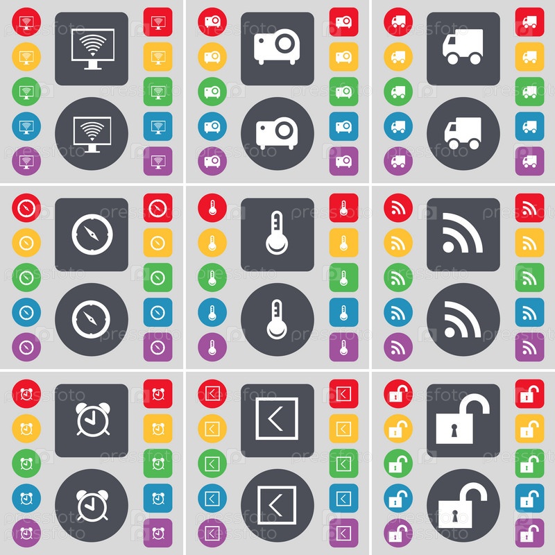 Монитор, проектор, грузовик, компас, термометр, RSS, будильник, стрелка слева, символ иконки замка. Большой набор плоских цветных кнопок для вашего дизайна