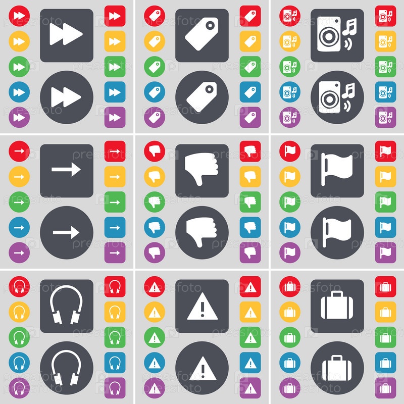 Перемотка назад, тег, спикер, стрелку справа, неприязнь, флаг, наушники, предупреждение, чемодан значок символа. Большой набор плоских, цветные кнопки для вашего дизайна. Вектор