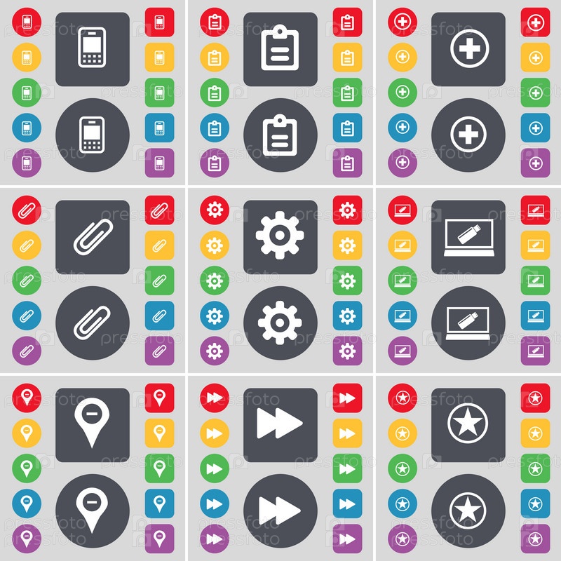 Мобильный телефон, исследования, плюс, клип, оборудование, ноутбук, контрольно-пропускной пункт, Rewind, звезда иконка символа. большой набор плоских цветных кнопок для вашего дизайна. вектор