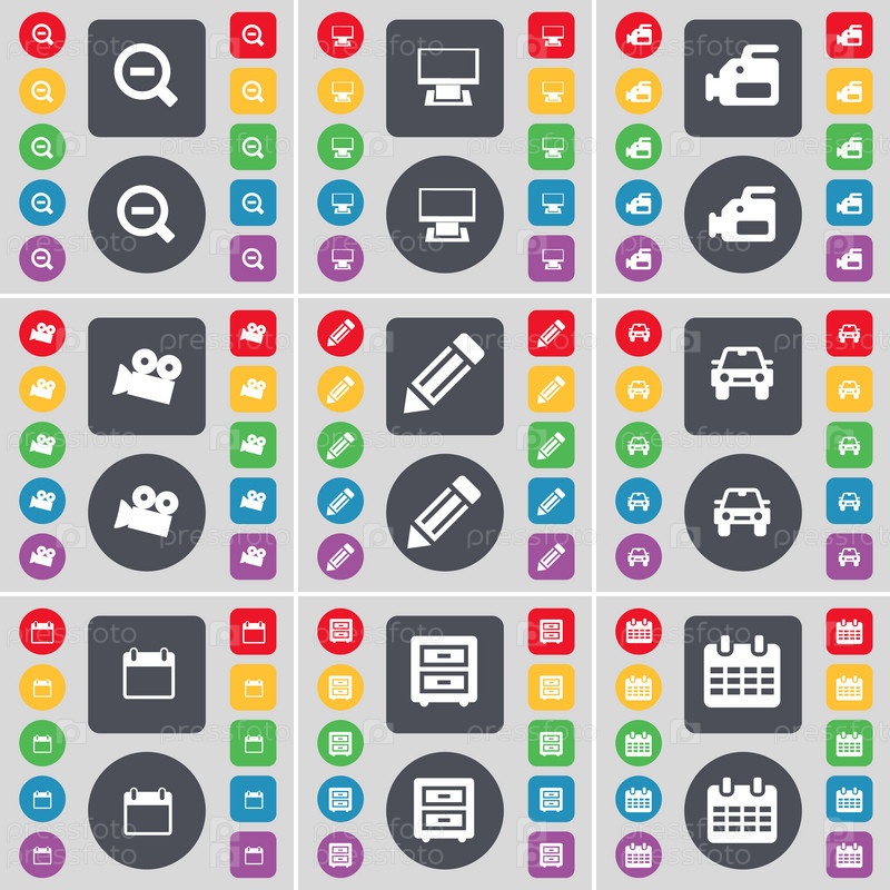 Увеличительное стекло, монитор, пленочной камеры, карандаш, автомобиль, календарь, тумбочка значок символа. Большой набор плоских, цветные кнопки для вашего дизайна. Вектор