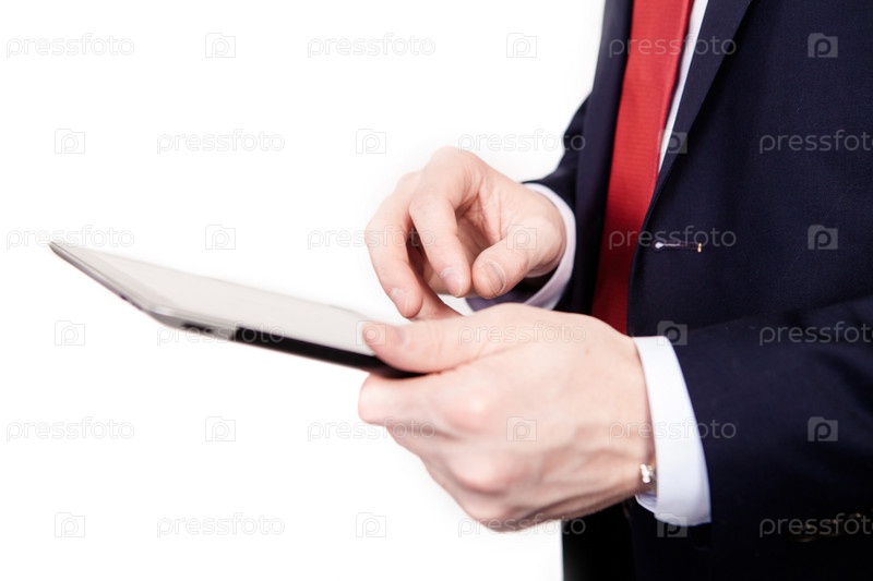 Мужчина в галстуке работает на планшетный компьютере