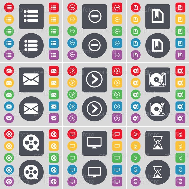 Список, минус, файл, сообщение, стрелка вправо, граммофон, видеозапись, монитор, Песочные часы значок символа. Большой набор плоских, цветные кнопки для вашего дизайна. Вектор