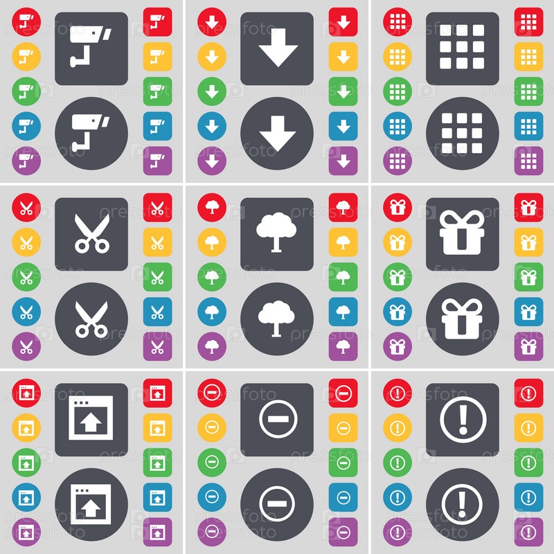 CCTV, стрелка вниз, приложения, ножницы, дерево, подарок, окно, минус, предупреждающие значки символа. большой набор плоских цветных кнопок для вашего дизайна. вектор