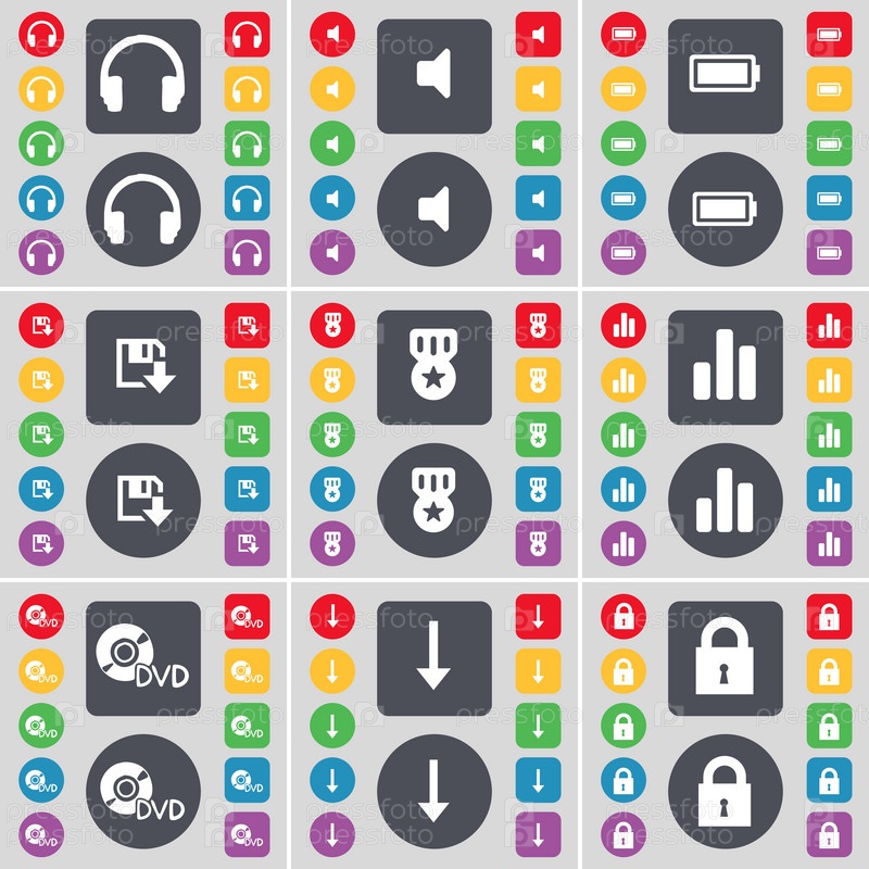 Наушники, звук, батарея, флопи, медальон, диаграмма, DVD, стрелка вниз, символ иконы замка. большой набор плоских цветных кнопок для вашего дизайна. вектор