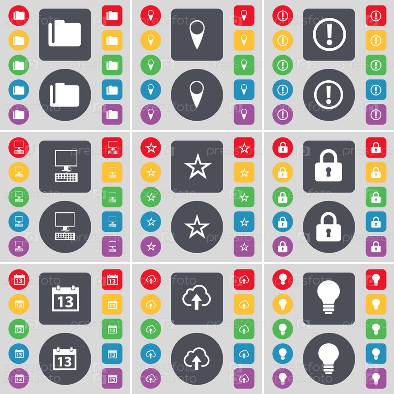Папка, контрольно-пропускной пункт, предупреждение, ПК, звезда, замок, календарь, облако, значок символ света лампы. Большой набор плоских цветных кнопок для вашего дизайна. вектор