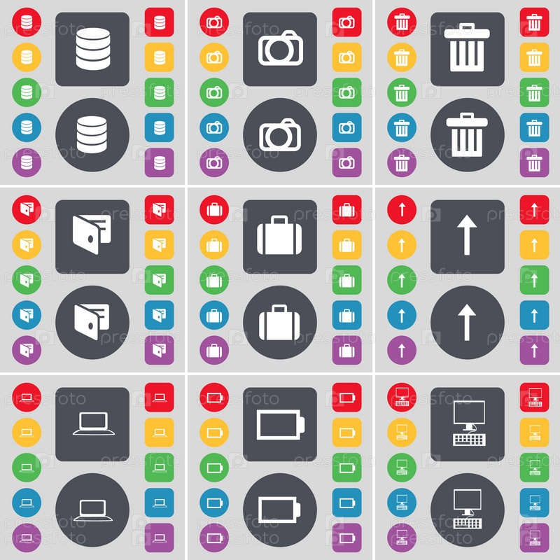 Базы данных, камеры, мусорные контейнеры, кошелек, чемодан, стрелка вверх, ноутбук, батареи, значок символа ПК. Большой набор плоских цветных кнопок для вашего дизайна. вектор