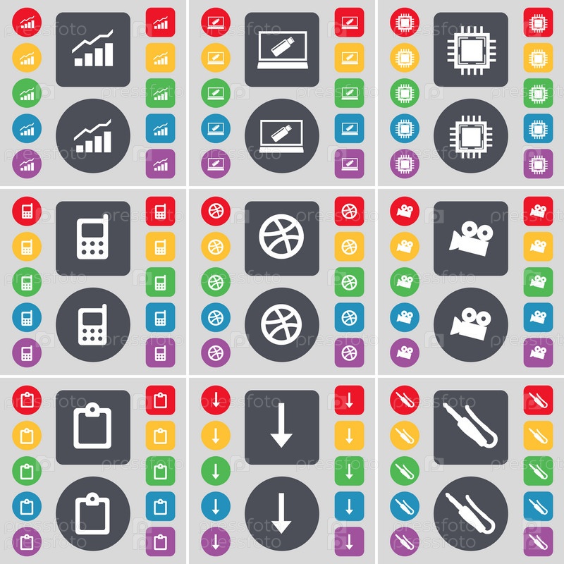 Граф, ноутбук, процессор, мобильный телефон, мяч, пленочной камеры, изыскания значок символа. Большой набор плоских, цветные кнопки для вашего дизайна. Вектор