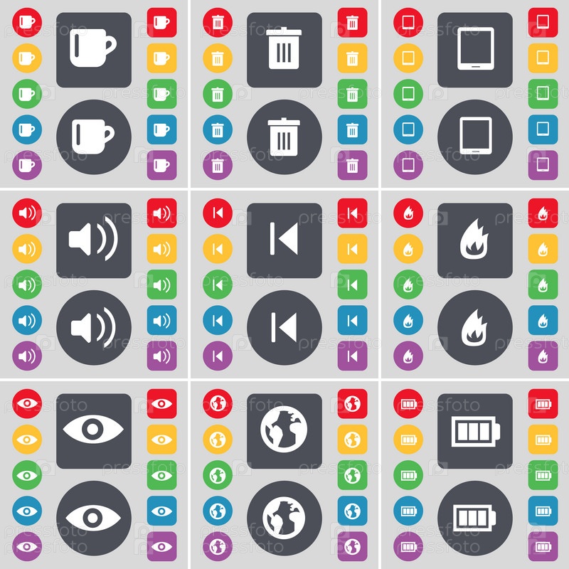 Чаша, мусорные корзины, планшетный ПК, звук, пропускать СМИ, огонь, видение, значок символа Eart. Большой набор плоских цветных кнопок для вашего дизайна. вектор