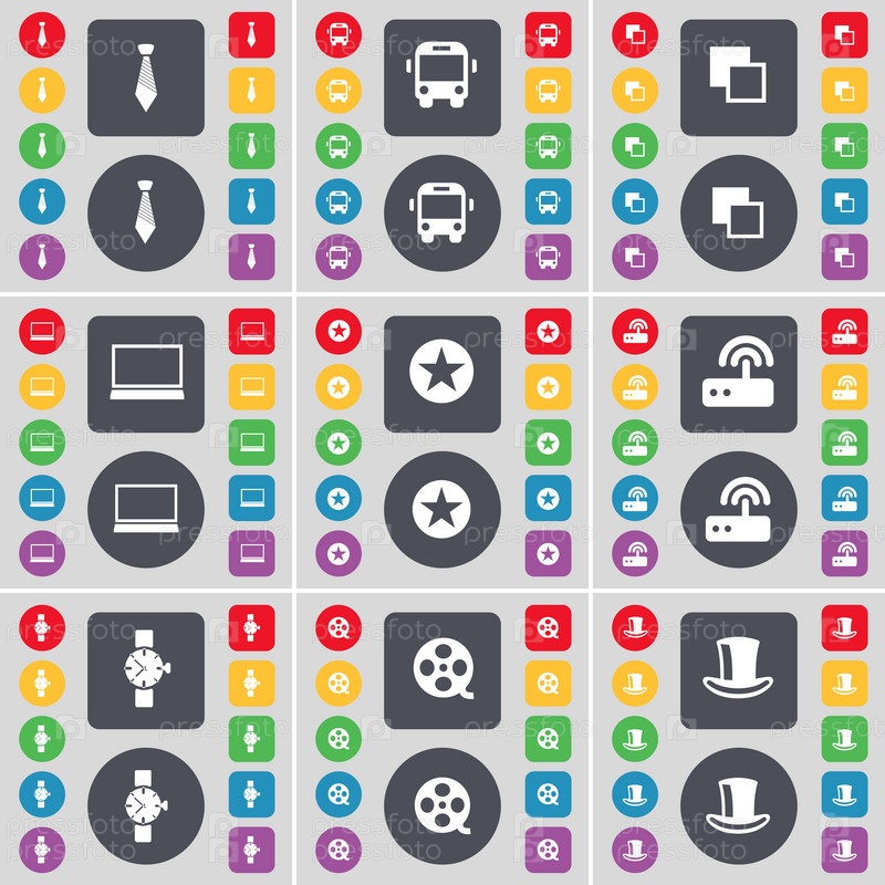 Галстук, автобус, копирования, ноутбук, звезда, маршрутизатор, наручные часы, видеозапись, шелк шапка значок символа. Большой набор плоских, цветные кнопки для вашего дизайна. Вектор