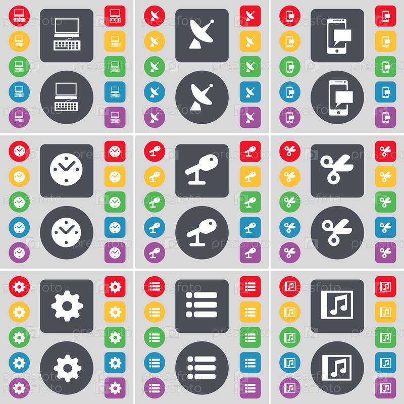Ноутбук, Спутниковая тарелка, SMS, часы, микрофон, ножницы, оборудование, список, музыка окна значок символа. Большой набор плоских цветных кнопок для вашего дизайна. вектор