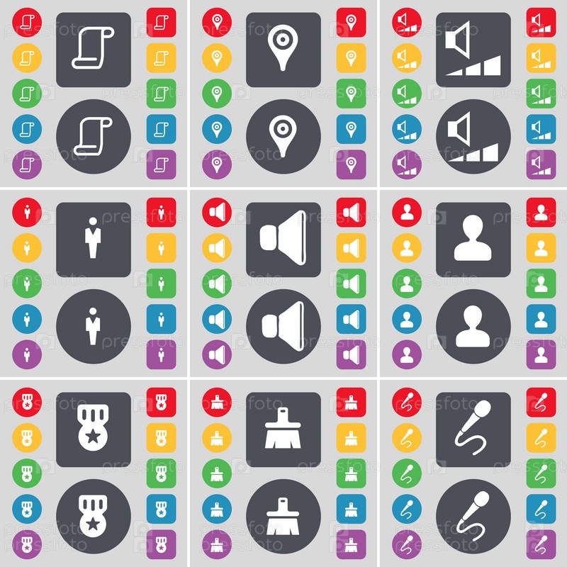 Прокрутки, контрольно-пропускной пункт, объем, силуэт, звук, аватар, медаль, кисти, символ значок микрофона. Большой набор плоских, цветные кнопки для вашего дизайна. Вектор
