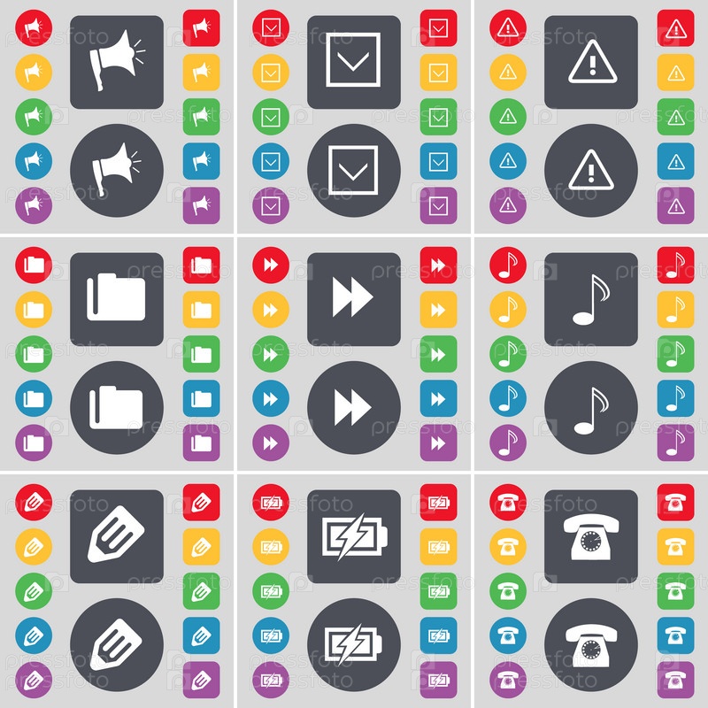 Мегафон, стрелка вниз, предупреждение, папка, Rewind, Замечание, карандаш, зарядное устройство, ретро-иконка символа телефона. Большой набор плоских цветных кнопок для вашего дизайна. вектор