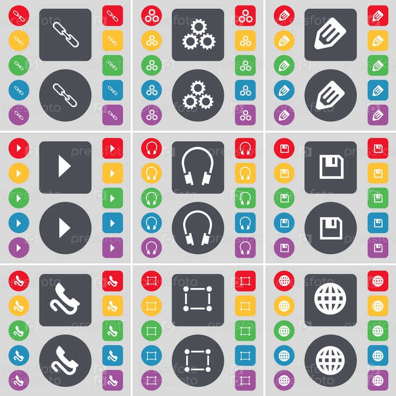 Ссылка, Гир, карандаш, средства массовой информации играют, наушники, флоппи, приемник, рама, глобус значок символа. большой набор плоских цветных кнопок для вашего дизайна. вектор