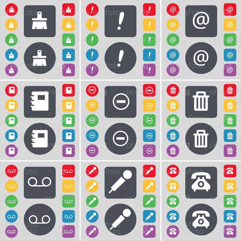 Кисть, восклицательный знак, почта, ноутбук, минус, мусорный бак, кассеты, микрофона, ретро телефон значок символа. Большой набор плоских, цветные кнопки для вашего дизайна. Вектор