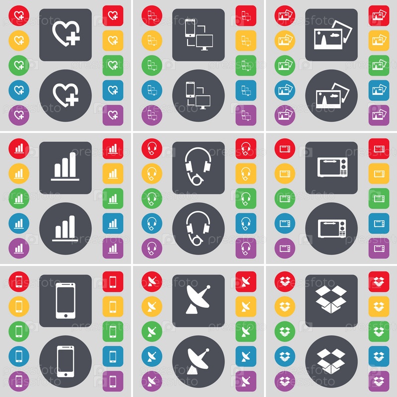 Сердце, связь, изображение, диаграмма, наушники, микроволновая печь, смартфон, спутниковая тарелка, значок символа Dropbox. Большой набор плоских цветных кнопок для вашего дизайна. вектор