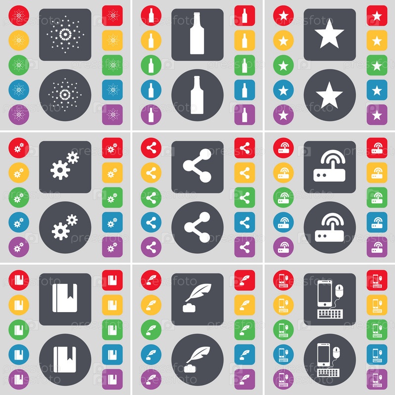 Звезда, бутылка, звезда, снаряжение, доля, маршрутизатор, словарь, чернильница, смартфон значок символа. Большой набор плоских, цветные кнопки для вашего дизайна. Вектор