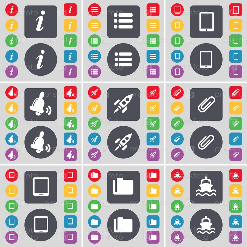 Информация, список, Таблетный ПК, Белл, ракета, клип, Tablet PC, папка, корабль значок символа. Большой набор плоских цветных кнопок для вашего дизайна. вектор