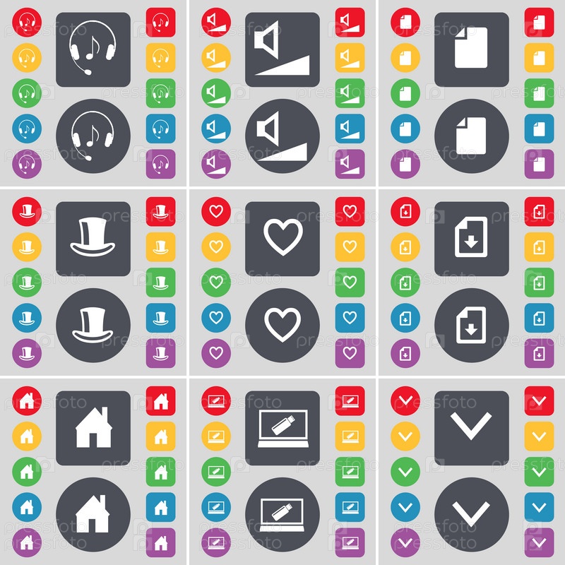 Наушники, объем, файл, шелк шапка, сердце, скачать файл, дом, ноутбук, стрелка вниз значок символа. Большой набор плоских, цветные кнопки для вашего дизайна. Вектор