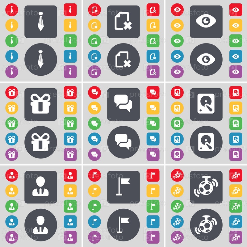 Галстук, файла, видение, подарок, чат, жесткий диск, аватар, гольф отверстие, Спикер Иконка символ. Большой набор плоских, цветные кнопки для вашего дизайна. Вектор