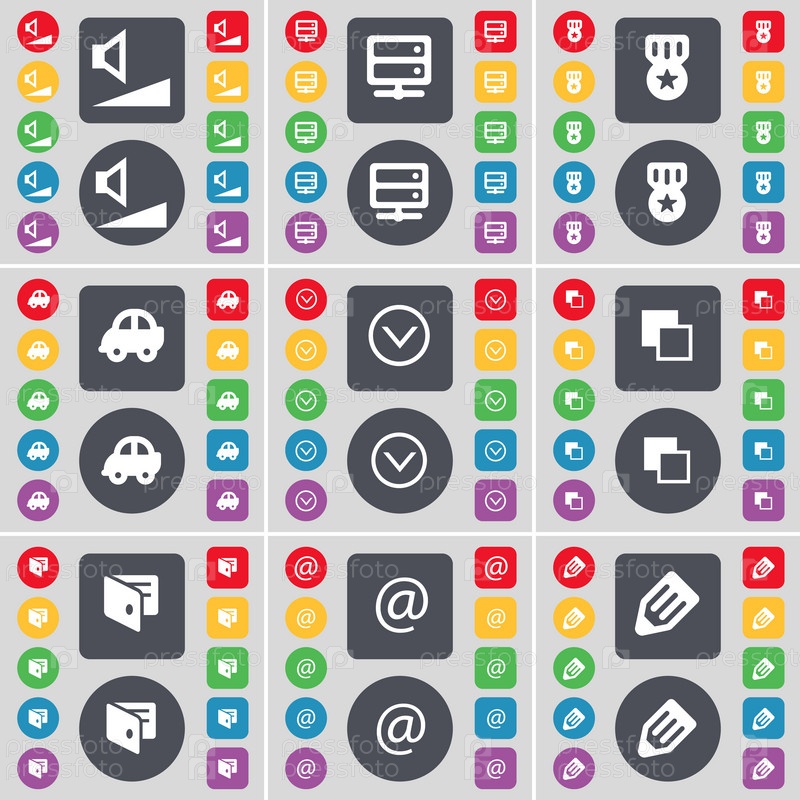 Объем, сервер, медаль, автомобиль, стрелка вниз, копирования, бумажник, почта, символ Пенце значок. Большой набор плоских, цветные кнопки для вашего дизайна. Вектор