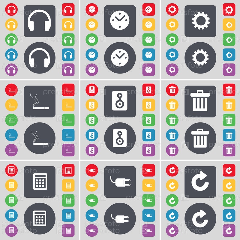 Наушники, часы, снаряжение, сигареты, спикер, мусорный бак, калькулятор, розетка, перезагрузить значок символа. Большой набор плоских, цветные кнопки для вашего дизайна. Вектор
