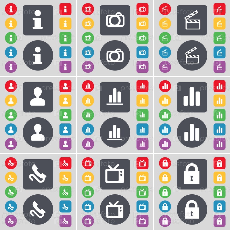 Информация, камеры, Клаппер, аватар, диаграмма, приемник, Ретро ТВ, символ значок замка. Большой набор плоских, цветные кнопки для вашего дизайна. Вектор