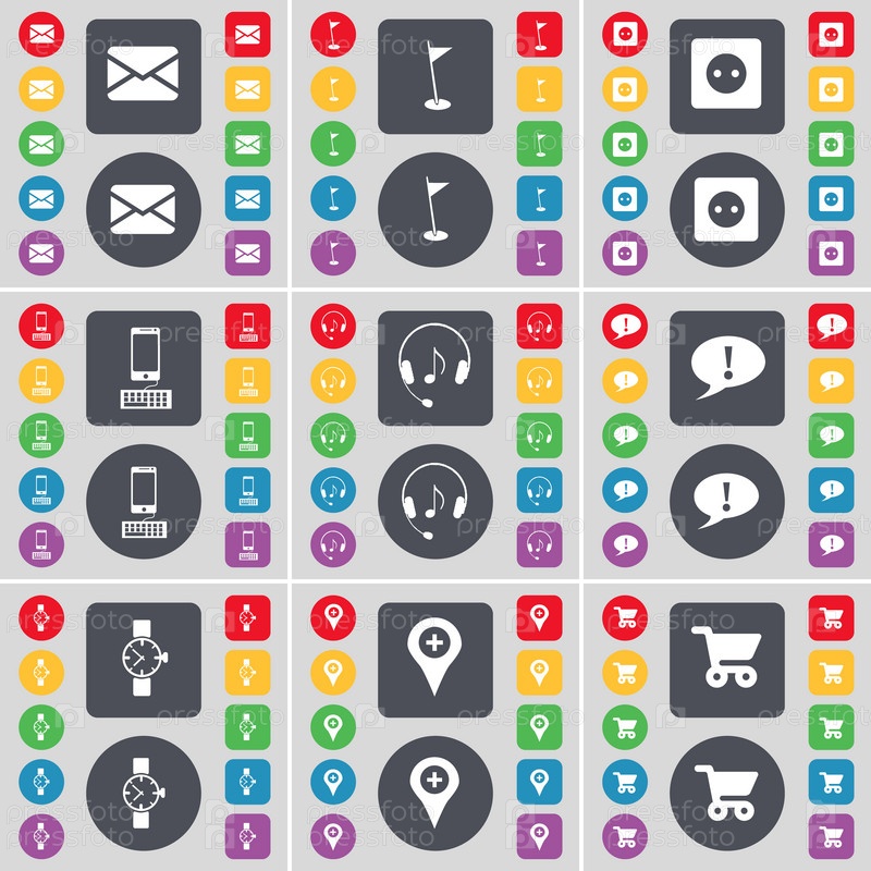 Сообщение, гольф отверстие, гнездо, смартфон, наушники, чат пузырь, наручные часы, контрольно-пропускной пункт, торговых тележка значок символа. Большой набор плоских, цветные кнопки для вашего дизайна. Вектор