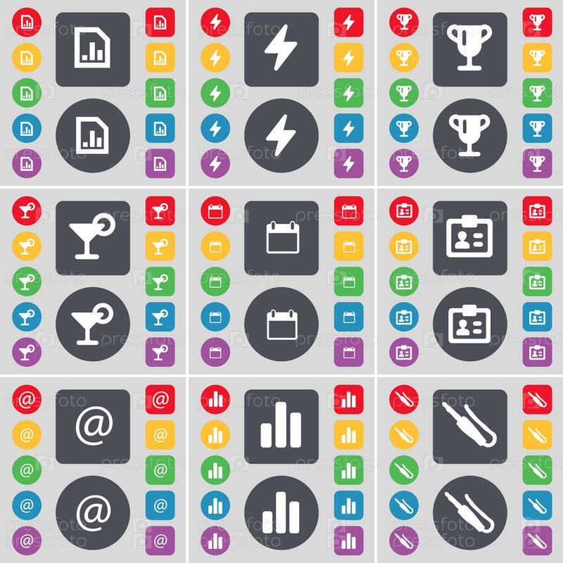 Схема файла, Флэш, Кубок, Коктейль, Календарь, Контакты, Почта, Диаграммы, Микрофон Подключатель значок символа. Большой набор плоских цветных кнопок для вашего дизайна. Вектор
