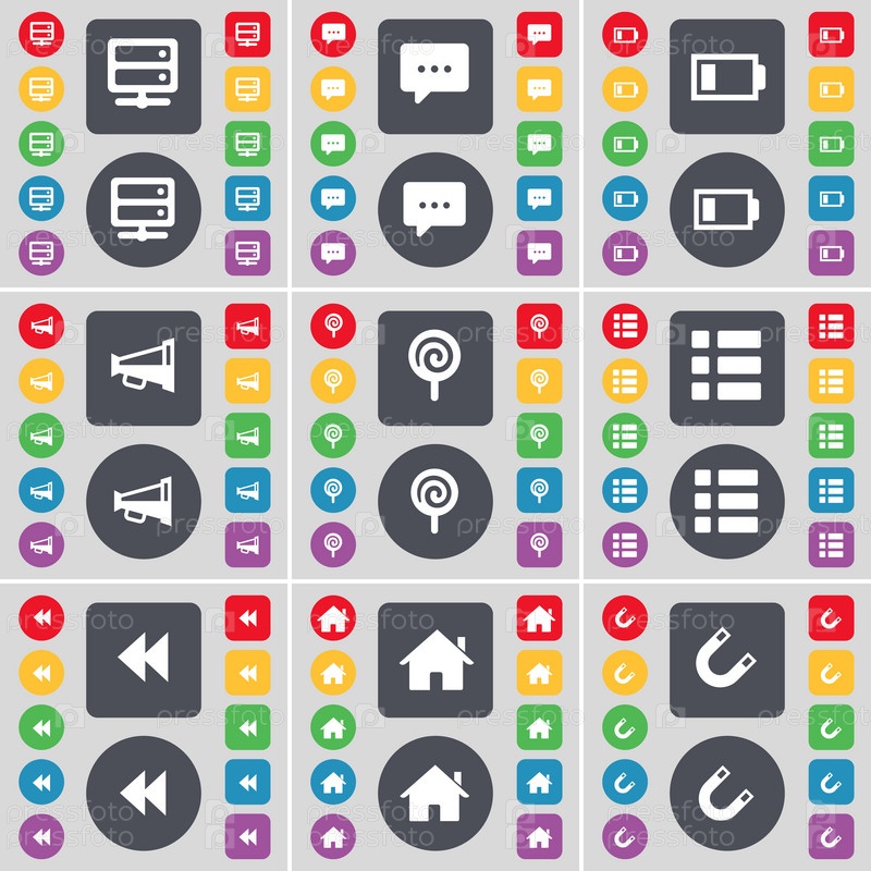Кровати таблицы, чат пузырь, батарея, Мегафон, леденец, список, перемотка назад, дом, символ значок магнита. Большой набор плоских, цветные кнопки для вашего дизайна. Вектор